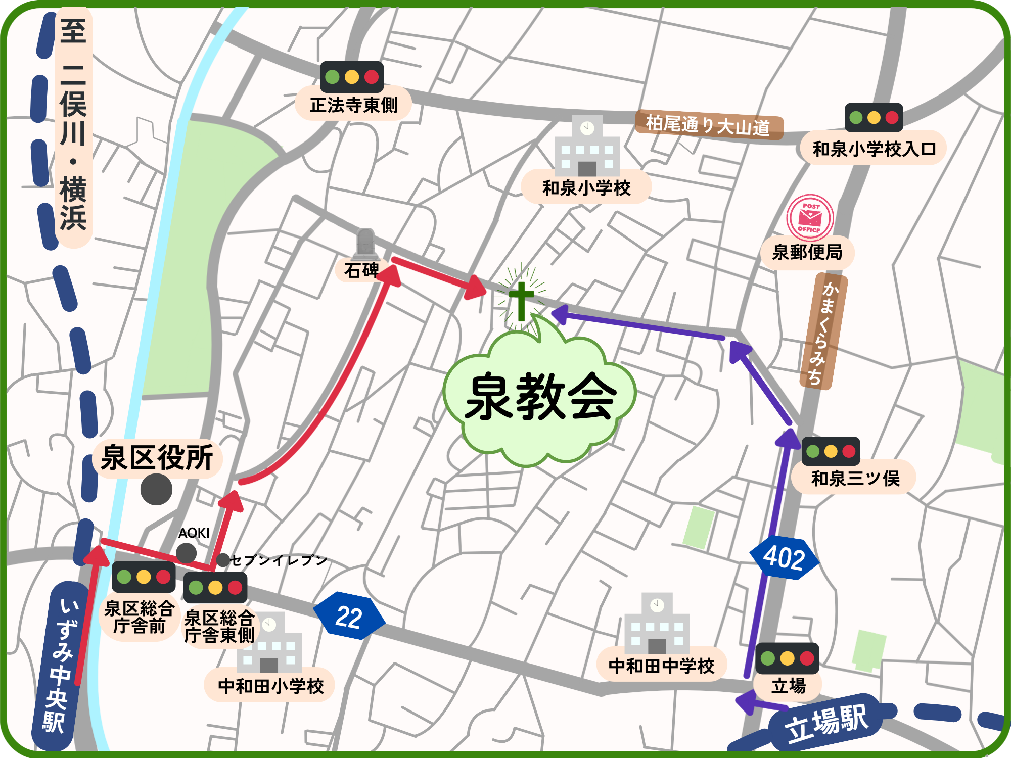 | 電車の場合 | 相鉄線「いずみ中央」駅、 市営地下鉄「立場」駅、どちらも徒歩17分 |